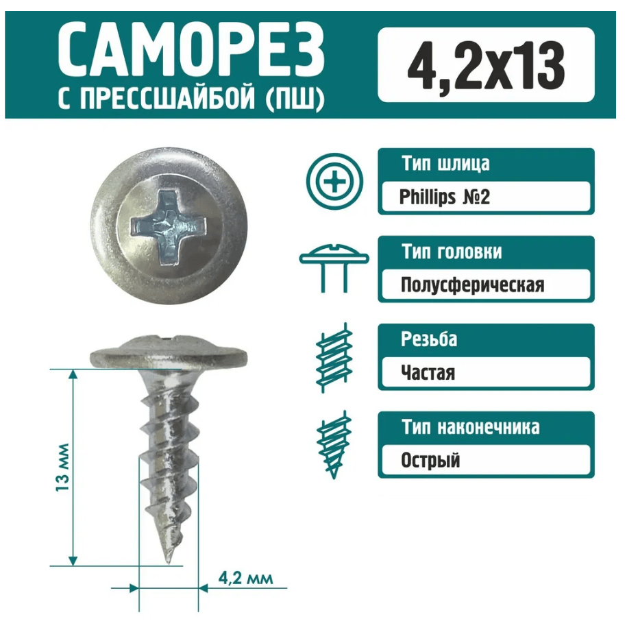 Саморез с прессшайбой острый 4,2х13 мм, оцинкованный, в количестве 1000 штук — это крепёжный элемент с полусферической головкой, которая служит для распределения давления при монтаже и увеличения площади контакта с закрепляемым материалом.