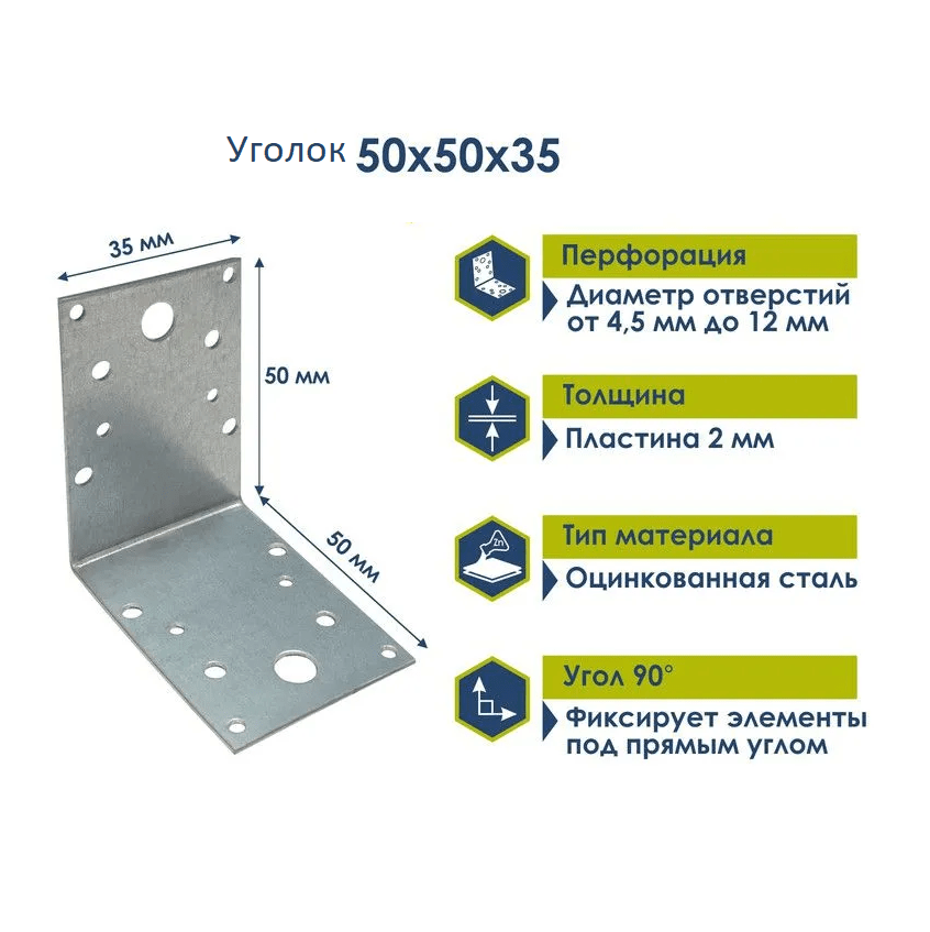 Уголок крепежный усиленный 50x50x35x2 мм — это элемент, предназначенный для скрепления массивных конструкций, например, тяжелых деревянных панелей. Он устойчив к воздействию внешней среды и имеет удобную перфорацию для крепления шпильками, саморезами или анкерами.