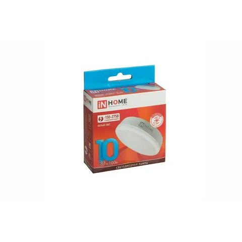 Светодиодная лампа IN HOME GX53 мощностью 10 Вт и цветовой температурой 6500 K создаёт холодный свет. Подойдет к уютному интерьеру.